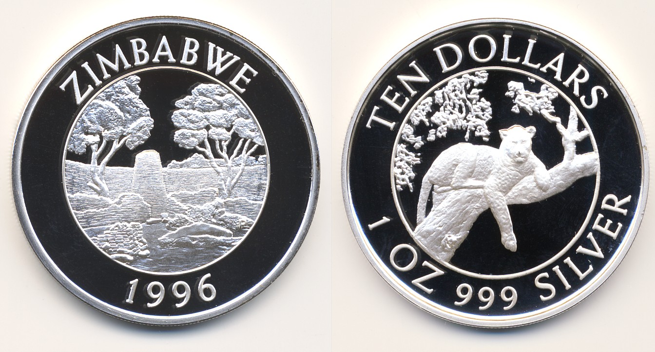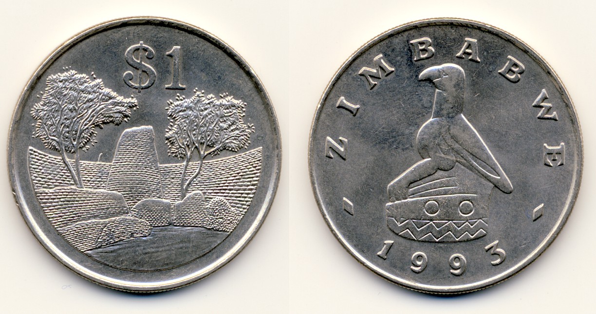 Die erste Münze ist eine Silber-Gedenkmünze von 1996 zu 10 Zimbabwe-Dollars (Gewicht 32,04 Gramm / 40,5 mm Durchmesser; KM#9 bzw. S#67), die zweite ein gewöhnlicher Dollar von 1993 aus Kupfer-Nickel (9,95 Gramm / 29,0 mm; KM#6 bzw. S#60). Zur letzteren Münze darf ich bitte noch ein paar Worte mehr verlieren. Auf der Rückseite befindet sich, wie bei allen simbabwischen Kursmünzen, der “Zimbabwean bird“. Abbildungen dieses Vogels fanden sich in Great Zimbabwe in der Größe von etwa 40 cm auf einer ganzen Anzahl von Säulen platziert. Diese Darstellung ist heute Bestandteil des simbabwischen Wappens und auch der Landesfahne.