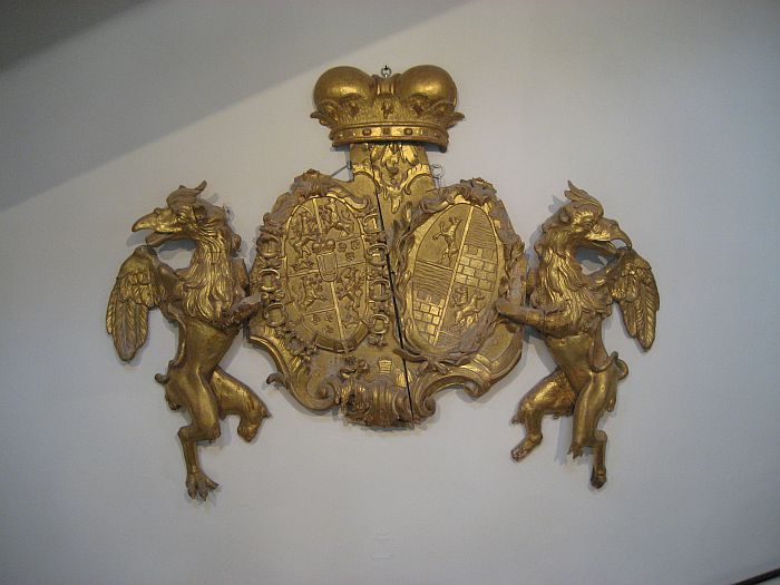Und dann muß ich noch mit etwas Akribie nerven: Das schöne Bild mit den güldenen Wappen hast du den Esterhazys zugeordnet. Das ist ja richtig, aber es sind zwei Wappen. Dasjenige mit der Ordenskette vom Goldenen Vlies umlegte ist das von Nikolaus I. Fürst von Esterhazy (1762-1790) und zwar nach 1765, denn erst in diesem Jahr erhielt er den Toison. Das andere ist das Wappen seiner Frau, der Maria Elisabeth Gräfin Ungnad von Weißenwolf. Im 1. Viertel der weiße Wolf, das im 4. Viertel sind zwei Windhunde...