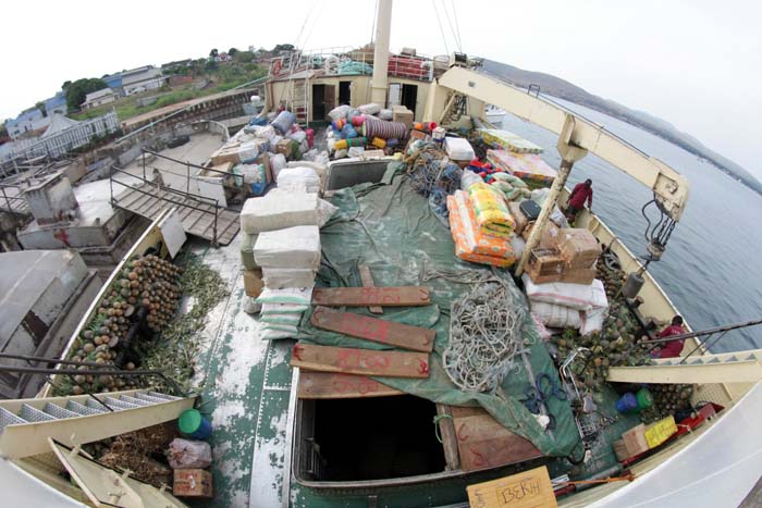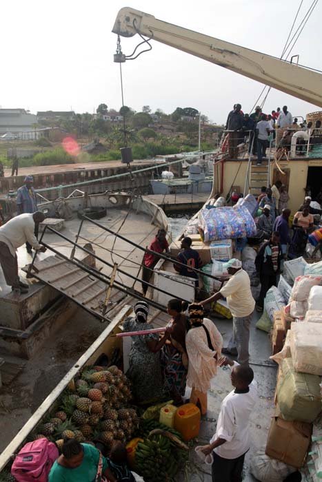 den „Gebrauchten“ Zustand des Schiffes setzte sich im innern fort. Von der fehlenden Feuerlöschanlage bis zu Fußballgroßen Löchern in der Decksbeplanckung waren alle Art von Mängel zu finden. Gegen 15:00 Uhr wurde das Gate geöffnet und die Passagiere strömten auf das Schiff. In anbetracht den Menschenmengen die auf Zugang zum Schiff warteten, betrachteten wir den geplanten Abfahrtstermin von 16:00 Uhr als nicht haltbar. Und in der Tat wurden Unmengen Ananas, Matratzen, Kleidung, Hühner, Möbel, Zement und alle Art von Waren über eine angelegte Planke eingeladen. Interessanterweise wurde alles auf Deck verstaut, der Laderaum blieb leer. Wir suchten inzwischen unser Kabine auf. Wir hatten mit Glück die Kabine Nummer 1 in Fahrtrichtung die linke vordere Eckkabine erwicht. Diese Kabine gehört noch zum Originalaufbau der Graf Götzen, die Inneneinrichtung wurde natürlich inzwischen erneuert. Die winzige Kabine zeichnete sich unter anderem durch ein Waschbecken mit fließend Wasser aus und das ist wörtlich zu nehmen, der Wasserhahn ließ sich nicht abstellen, so dass man ständig einen gewissen Harndrang verspürte. Die im Etagenbett verbauten Kunststoffmatratzen erinnerten an Arztliegen und führten beim vorherschenden tropischen Klima dazu, dass man mit unbekleideten Körperteilen kleben blieb.