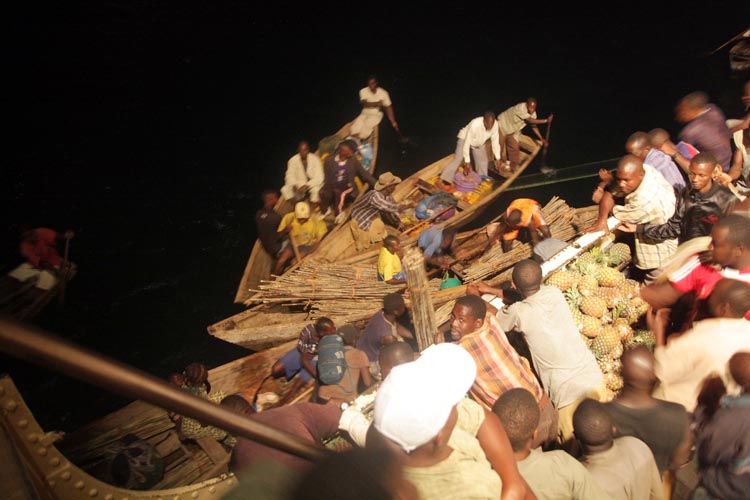 Dieses Schauspiel wiederholte sich nun im Rhythmus von 2 Stunden. Gegen 2 Uhr Nachts errichten wir unsere Station Mahale. Zum Ausbooten mussten wir mit unserem Gepäck in die dritte Klasse unter Deck, hier befanden sich die Ausgänge in den Bordwänden. Schon an der Treppe erwartete uns ein unglaubliches Gedränge. Es dauerte ein wenig bis wir uns bis auf 3 Meter an die Tür herangeschoben hatten. Ein Blick in den Passagierraum ließ ein Gefühl dafür aufkommen wie sich Sardinen in der Dose fühlen müssten. Noch war nicht klar mit welchem Boot wir übergesetzt werden sollten. Als ich nach einem Boot zum Mahale fragte meldeten sich sofort mehrere Bootsbesitzer, einer entriß mir gleich den Rucksack und versuchte sich durch den Gang zu seinem Boot durchzuschlagen. Als ich den Holzeinbaum sah, war mir klar das konnte nicht das richtige Boot sein. Ich nutze den Streit des Bootsführers mit einem Kollegen, der ebenfalls den Transportauftrag haben wollte und nahm den Rucksack wieder an mich. Ein anwesender Ranger des Parks erkannte wohl unsere Reiseabsicht und teilte uns mit dass das Boot der Parkverwaltung noch nicht da sei und wir noch warten sollten.