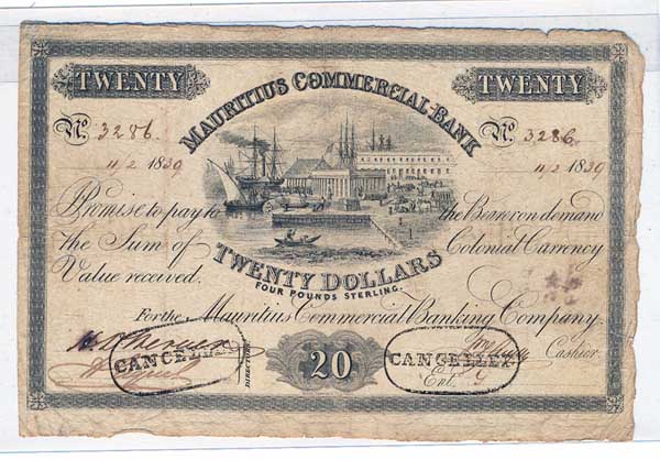 Laut Pennington war die offizielle Währung, in der auch Bücher geführt werden mußten, seit 1826 das Pfund Sterling. Der Dollar zu 4 Shilling war eine Rechnungsmünze ("Nominal Dollar of the Mauritius"). Für bestimmte Münzen gab es offizielle Kassenkurse: Frz. 5, 2, 1 Francs, sizilianische Scudi und 40 und 20 Grani, spanische Dollar (4 s 4 d), US-Dollar (dito), Calcutta Rupie (2/1) und Bombay Rupie (1/11). Die frz. 2 und 1 Franc-Stücke waren überbewertet im Verhältnis zu anderem Silber (1/8 und -/10) und flossen deshalb reichlich ins Land, verdrängten auch andere Münzsorten. Die Bank machte also bei der Einlösung der eigentlich auf 4 Pfund Sterling lautenden Note gegen frz. Silbergeld von ca. 96,4 Franc einen Gewinn von einem halben Penny pro Franc, also satte 4 Shilling.