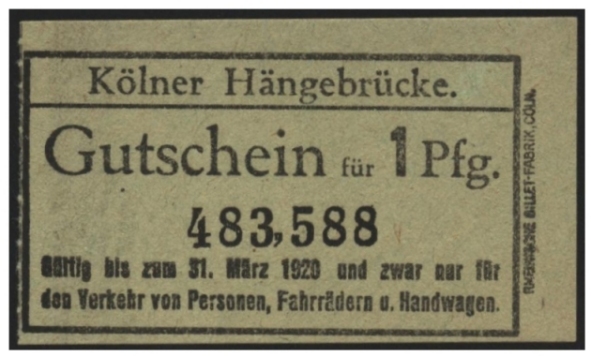 In Köln gab es vor 1915 Brückenmarken für die Benutzung der Schiffsbrücke, die anstelle der Deutzer Brücke den Rhein überquerte. Zum Beispiel mußten Fußgänger 2 Pfennig zahlen, für den Güterverkehr war die Gebühr höher. Auch die Köln-Mindener Eisenbahn gab an die Passagiere, die ins linksrheinische fahren wollten, Marken aus.