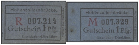 In Köln gab es vor 1915 Brückenmarken für die Benutzung der Schiffsbrücke, die anstelle der Deutzer Brücke den Rhein überquerte. Zum Beispiel mußten Fußgänger 2 Pfennig zahlen, für den Güterverkehr war die Gebühr höher. Auch die Köln-Mindener Eisenbahn gab an die Passagiere, die ins linksrheinische fahren wollten, Marken aus.