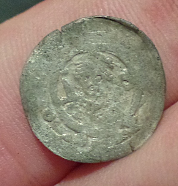 Münze 1 : Gewicht ca. 0,5g, Durchmesser: 17mm Pfennig (?) eine Seite mit der Abbildung einer Person mit Schwert (?) andere Seite eine florale Darstellung