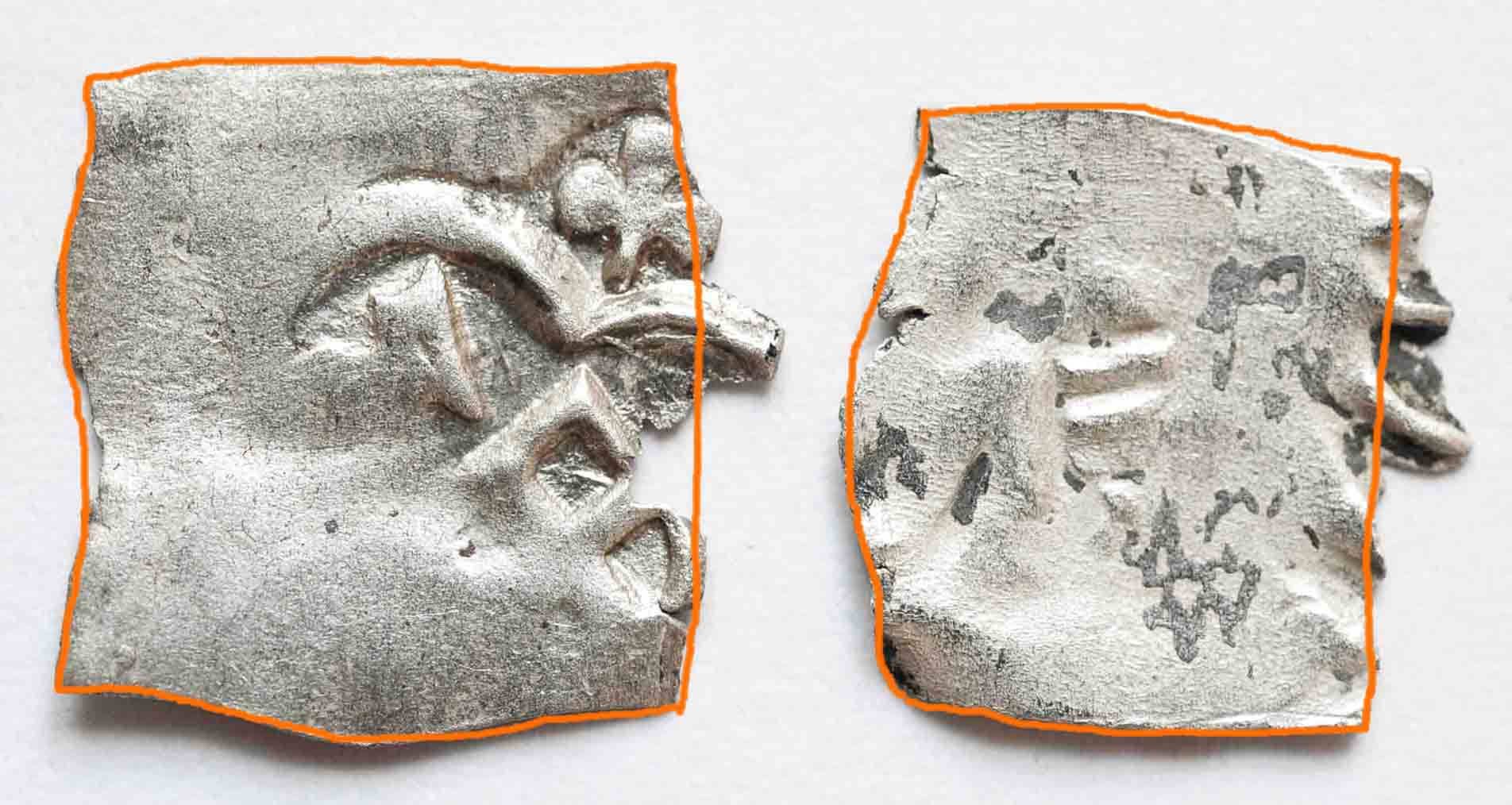 Zur Untermauerung meiner Theorie habe ich dir zwei Bilder hinzugefügt. Am ersten habe ich den bereits oben gezeigten Hälbling, vergleichsweise mit einen etwas größeren F a 13 Hälbling (11 mm, 0,20g) zusammengelegt. In diesem Fall war der Stempel aber nicht größer als der Rohling, sondern beim Schlagen nur sehr schlecht zentriert verwendet worden. Am zweiten Foto habe ich die ursprünglichen (gedachten) Ränder der Münze nach dem Vierschlag und vor der Prägung, farblich gekennzeichnet.
