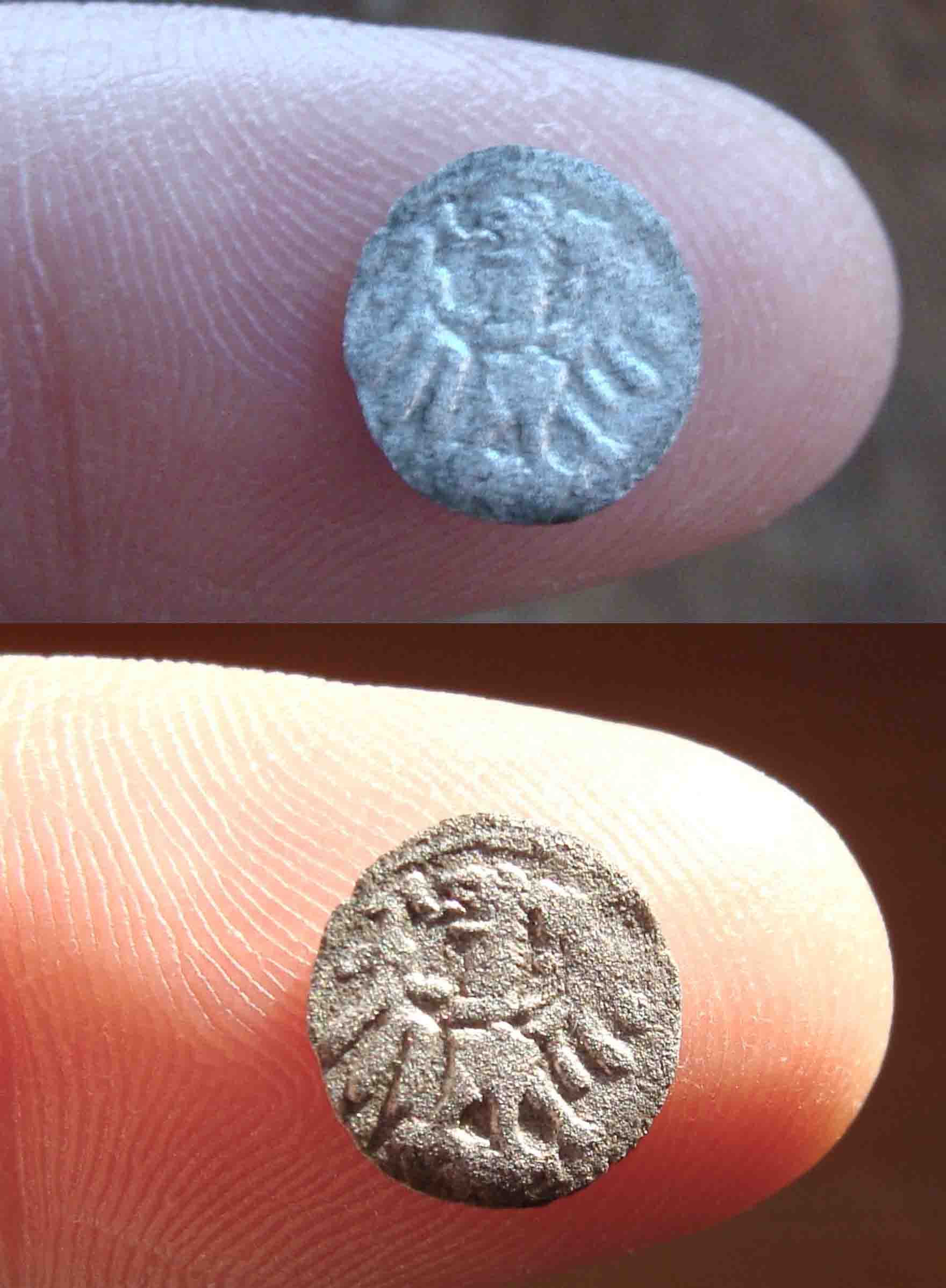 dieser (vermutliche) Heller gehört mit einem Gewicht von 0,13gr. und einem Durchmesser von 9,5 x 9 mm zu den kleinsten Silbermünzen, die ich jemals in Händen hatte. Am Avers (?) findet sich ein (schlesischer?) Adler, Kopf nach links mit weit herausgestreckter Zunge. Das Motiv am Revers (?) kann ich leider nicht deuten und habe es in zwei verschiedenen Positionen im scharfen Streiflicht fotografiert.