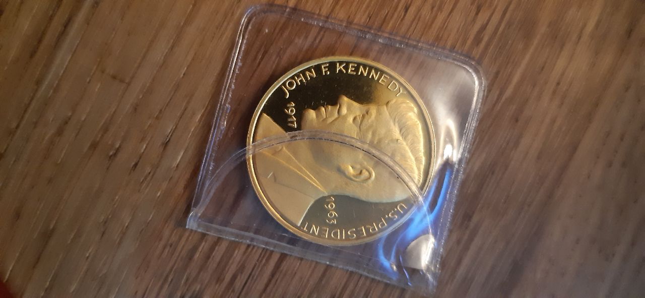 Eine privat geprägte Goldmedaille (Punze 900) auf John F. Kennedy. Der Hersteller ließe sich vielleicht aus der Punze neben der 900 herausfinden. Bringt immerhin mindestens den Goldpreis. Grüße, KarlAntonMartini