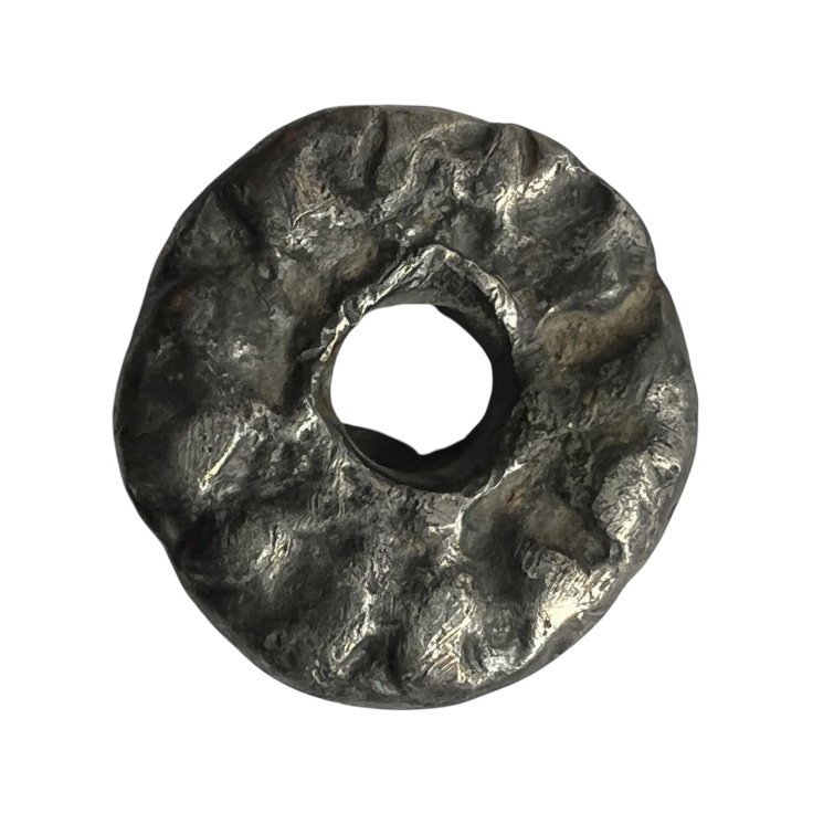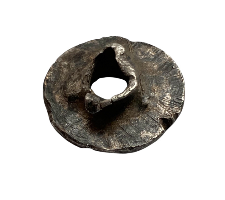 Das "Ding" ist aus Silber, hat einen Durchmesser von 12 mm und ein Gewicht von 1,2 Gramm. Wäre nicht die komische Rückseite, hätte mein Bauchgefühl an einen durchschlagenen Kelten gedacht.