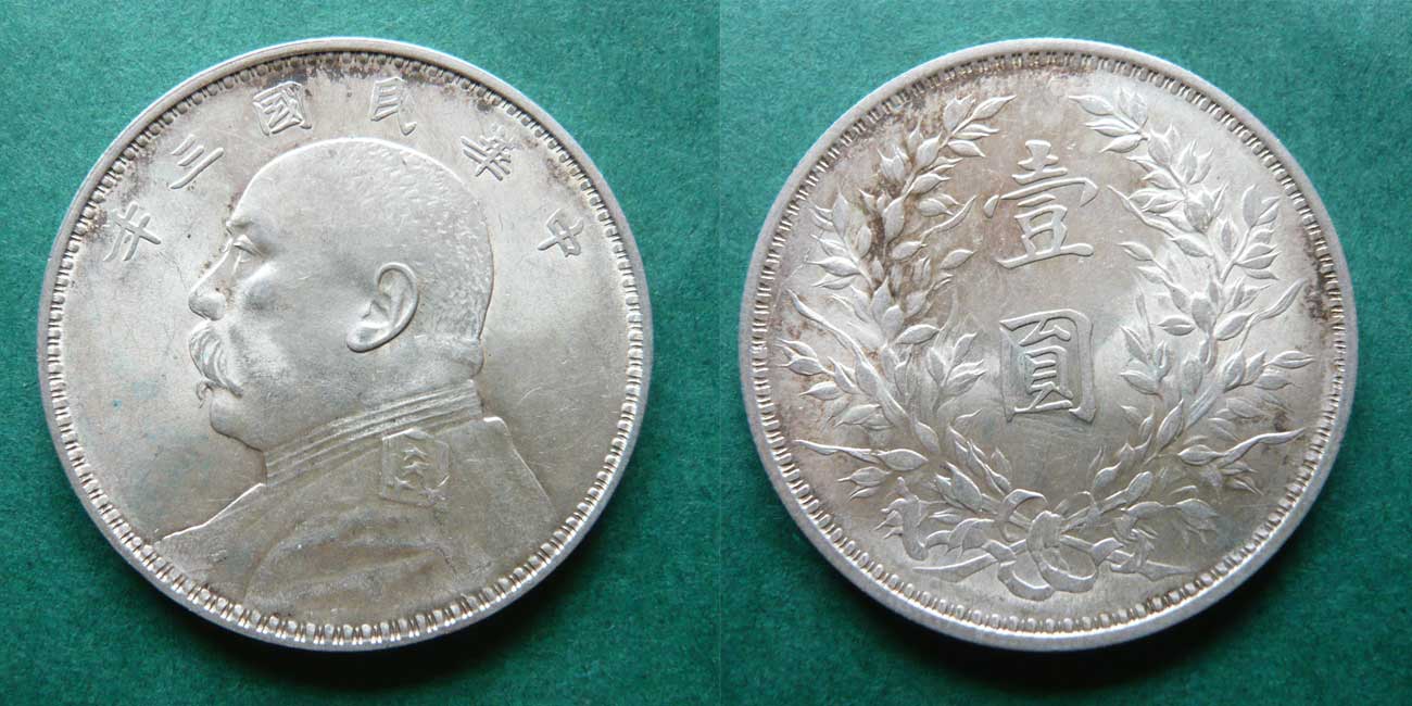 Dargestellt ist Yuan Shikai, darüber steht (von rechts nach links) Zhonghua Minguo (Republik China) 3 Nien (Jahr 1914). Die Wertseite trägt die Inschrift (von oben nach unten) Yi Yuan (1 Dollar).