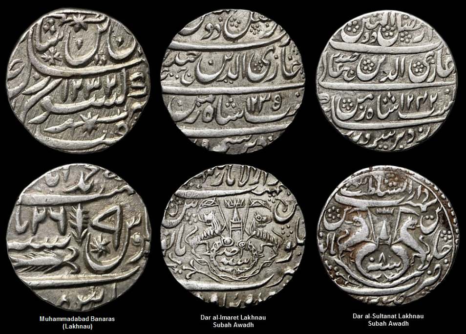Für Awadh begann der Niedergang in der 2. Hälfte des 18. Jahrhunderts, als ein Aufstand im benachbarten Bengalen scheiterte und die vereinigten Streitkräfte des Großmoghuls, Bengalens und Awadhs von den Briten in der Schlacht von Boxar (1764) vernichtend geschlagen wurden. Awadh verlor die östliche Hälfte seines Reichs an die EIC und mußte schwere Reparationen zahlen. Auch die Münze in Banaras mußte 1776 (RY 17 s. unten) an die EIC abgetreten werden. Awadh setzte seine Prägetätigkeit u.a. in