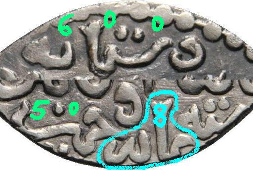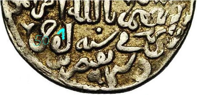 In folgendem Fall (Münzstätte Sivas) erscheinen sowohl die 50 (خمسين (chamsin)) als auch die 1 (احدى (ihda)) als Numeral. Das finale "a" sieht nicht nur ungewöhnlich aus, sondern nimmt auch sehr viel Platz ein.