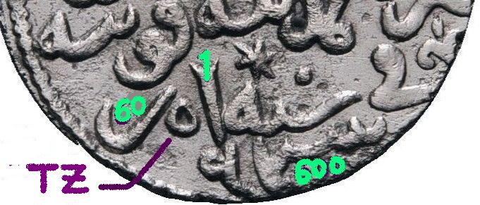 Und hier ist die versprochene Münze (Qilidsch Arslan IV.; zweite Regierung) aus 661 AH, bei der die 1 als Ziffer und die 60 als Diwani-Numeral erscheinen. 600 (ستّ مئة (sitt mi'at)) ist in der üblichen Buchstabenfolge geschrieben. Das, was wie die Ziffer 5 (O) aussieht, ist lediglich ein Trennzeichen (TZ), das m. E. mehr zur Verwirrung beiträgt.