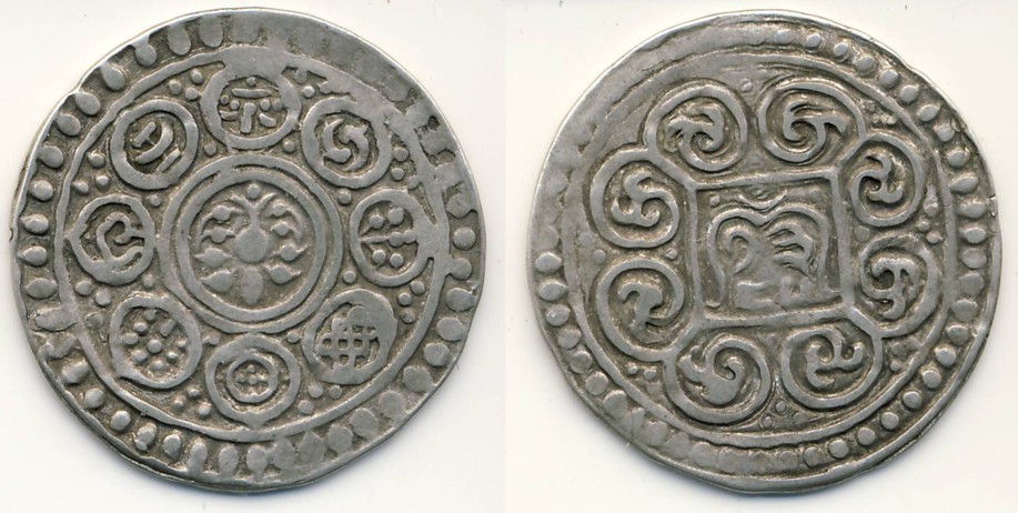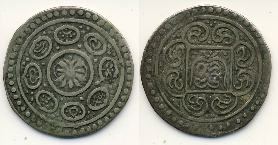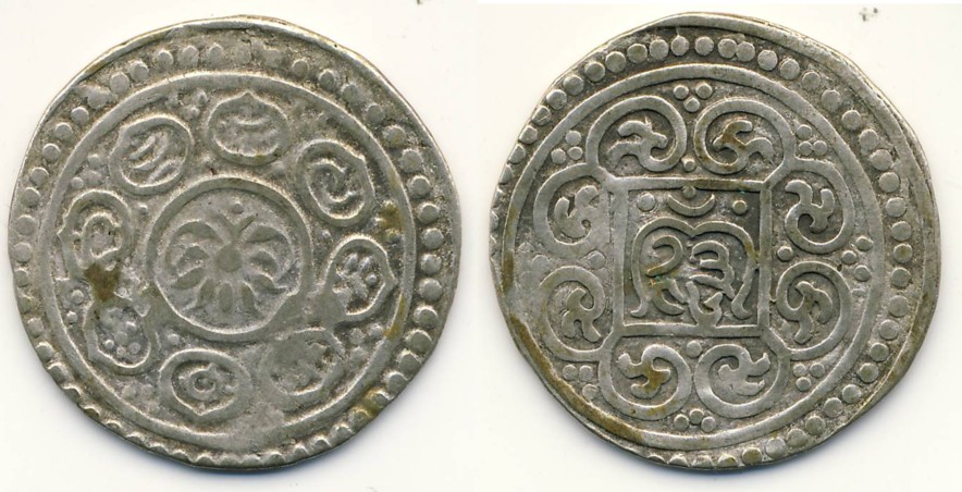 Tibet litt immer mehr unter eine Münzknappheit. Schon AD 1763/64 ( Vartula-Tangka, C #5) und nochmals 1785 (Sri-Mangalam-Tangka, C #10, und Sucakra-Tangka, #15) gab es eigene Prägungen, die jedoch extrem selten sind. Der letzte C #5, den ich sah, wurde für 3.000 € verkauft, der letzte C #15 für 2.500 €. Hier ein Link zu einem schönen Sucakra-Tangka / Phags-pa-Tangka (C #15).