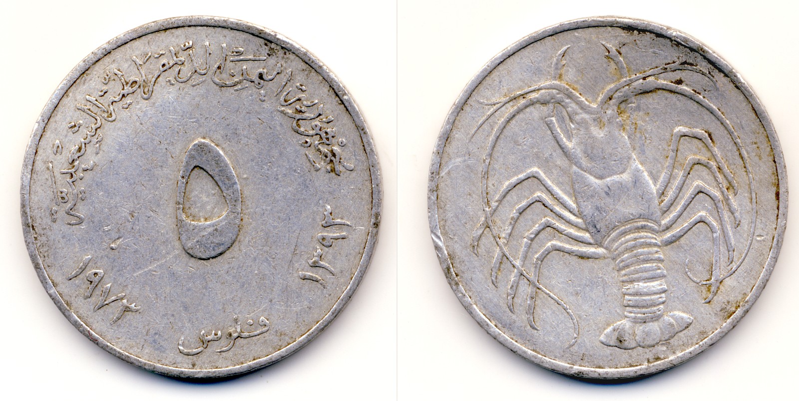 Also zusammengefasst: Das Alu-Stück ist aus dem südlichen Teil des heutigen Jemens. Yemen, Democratic Republic bzw Jemen (Aden). Wir sehen eine Alu-Scheibe zu 5 Fils, die bei KM unter #4 und bei Schön unter #7 geführt wird.