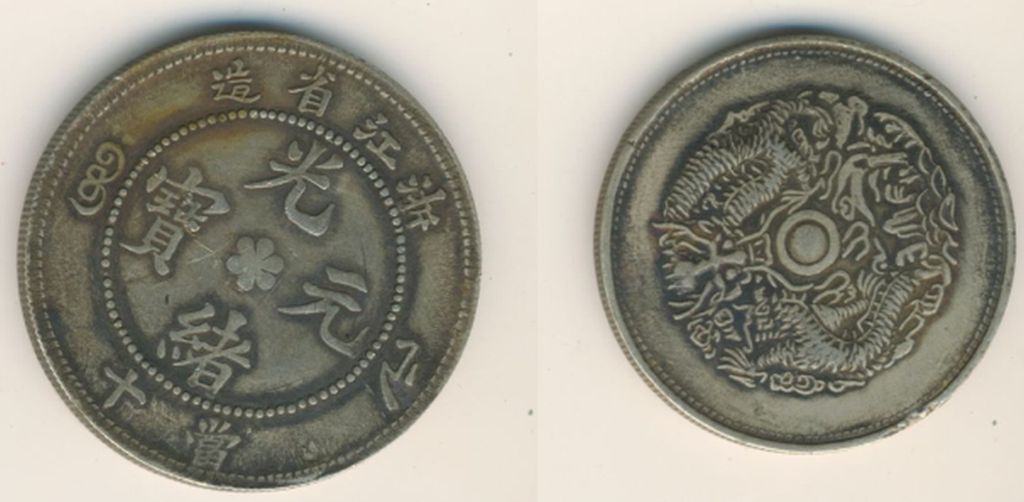 Das ist eine Phantasieprägung. Auf der Schriftseite steht unten 10 Cash, und 10 Cash gibt es aus der Provinz Chekiang / Zhejiang nur als reguläre Kupfermünze ... also nicht in Silber oder ähnlichem Metall. Hier zum Vergleich: