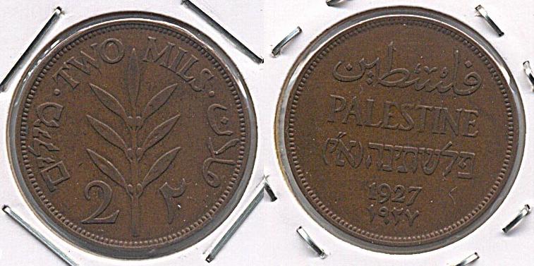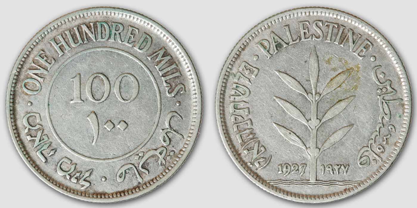 Die Briten besetzten 1917 das zum türkischen Reich gehörende Jerusalem und bis 1918 ganz Palästina. Dieser Zustand wurde 1920/1922 beendet, der Völkerbund erteilte den Briten ein offizielles Mandat zur Verwaltung. Die Briten reformierten 1927 das Münzwesen auf der Grundlage des Palästina-Pfundes, das dem Pfund Sterling entsprach. Das Pfund war eingeteilt in 1.000 Mils. Das Stück zu 100 Mils ist wertmäßig also ein Zehntel Pfund, das entspricht dem englischen Florin. Interessanterweise wurde das 100 Mils Stück mit höherem Silberanteil ausgebracht (720/1000el, 8,4 g. fein) als die gleichzeitig geprägten Florinstücke (500/1000el, 5,65 g fein). Geprägt wurden die Palästina-Münzen in der Tower Mint, London. Die Silbermünzen (es gab noch ein 50 Mil-Stück) wurden bis 1942 geprägt. Das Mandatsgebiet umfaßte das heutige Israel, die Palästinensergebiete, Jordanien und ein Stück der Golan-Höhen. Der Staat Israel machte nur 18% des Mandatsgebietes aus. Transjordanien wurde 1946 unabhängig, annektierte 1950 auch Cisjordanien, das Westjordanland (juristisch bis 1988) und nennt sich sei 1951 Haschemitisches Königreich Jordanien. Der Bruder des jordanischen Herrschers Abdullah wurde übrigens als Faisal II. König des Irak (beide regierten ab 1921 unter britischer Oberhoheit). Die Haschemiten-Herrscher entstammen einem Geschlecht, das lange als Könige des Hedschas regierte und den Posten des Großscherifs in Mekka und Medina innehatte, 1924 beanspruchten sie auch das Kalifat und damit die Oberherrschaft über alle muslimischen Araber. Sie wurden allerdings von dem König des Nedschd angegriffen und unterlagen den Wahhabiten, die bis heute Saudi-Arabien (Vereinigung von Hedschd und Nedschas) regieren. (Die Haschemiten vertreten einen erheblich liberaleren Islam als die Wahhabiten.) Die Auseinandersetzungen zwischen Israel und den Palästinensern um die Aufteilung des übrigen Gebietes sind bis heute nicht zu einem allseitig akzeptierten Ergebnis gelangt. Auffällig, daß es in allen Randgebieten des alten Osmanischen Reiches bis heute nicht zu einer stabilen Länderbildung gekommen ist, das gilt für den südlichen Balkan genauso wie für Kurdistan, Syrien, Libanon, Palästina und das Zweistromland, ja nicht einmal für Zypern. - Grüße, KarlAntonMartini