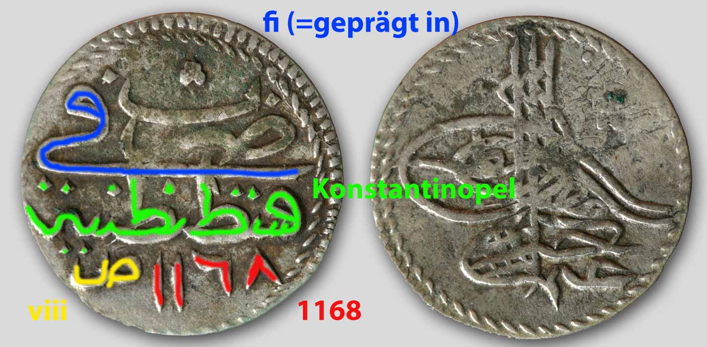 Gute Frage! Bei den Paras steht sie in der Regel zwischen den zwei Punkten und der Jahreszahl. Die zwei Punkte sind es also nicht, das Zeichen in der Tughra, das sich als nächstes anbieten würde, ist es aber auch nicht, da es auch auf Münzen mit Anfangsbuchstaben auftaucht.