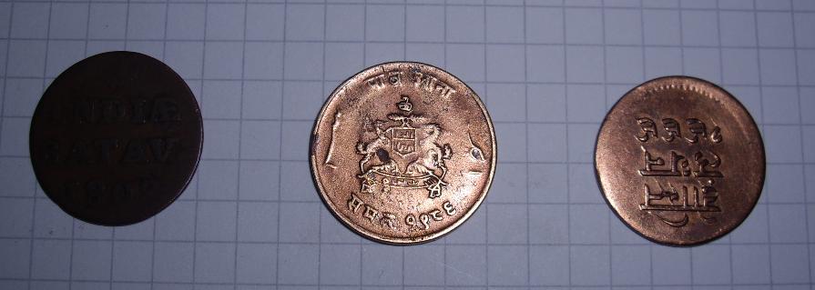 Die rechte Münze kommt glaub ich aus Mewar, 1/2 Anna, ca. 1940.