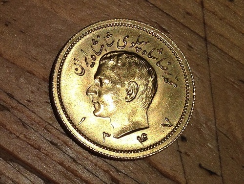 Die Goldmünze mit dem Löwen mit Säbel stammt aus Persion (Iran), 1 Pahlewi unter Mohammed Riza Pahlewi.