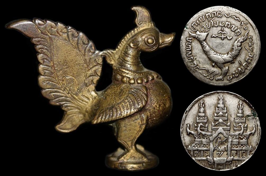Ich bin durch den unten abgebildeten Vogel auf diese naive Frage gekommen. Er kam vor vielen Jahren zusammen mit zwei anderen Skulpturen aus einem Nachlaß zu mir - lichte Höhe knapp 11 cm, Gewicht 548 g (also wohl massiv). Da die beiden anderen Figuren eindeutig aus Indien kamen, habe ich auch ihn dort verortet. Zeitlich einordnen kann ich die drei Skulpturen nicht - vermutlich Ausgang 19. Jh. bis erstes Drittel 20. Jh., jedenfalls wahrscheinlich keine modernen Massenprodukte. Irgendwann kam mir eine Münze aus meiner Sammlung in den Sinn, die das Motiv des Vogels sehr ähnlich zeigte. Mein alter Schön aus den 80-ern bezeichnete ihn als
