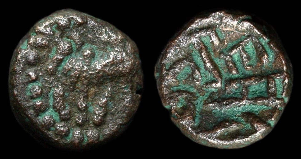 Ich habe hier eine kleine Bronze (10 mm; 2,11 gr.) die mich an Stücke der Nagas erinnert, allerdings fand ich dort kein Buckelrind in der hier gezeigten Stellung und auch die Schriftzeichen waren nicht ganz identisch. (Zeno habe ich schon durchgesehen). Vielleicht liege ich mit Nagas ja auch völlig falsch. Hättet Ihr eine Bestätigung oder einen Tipp?