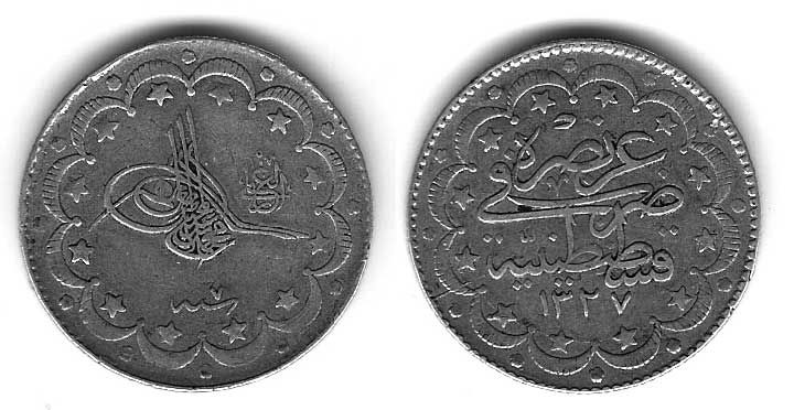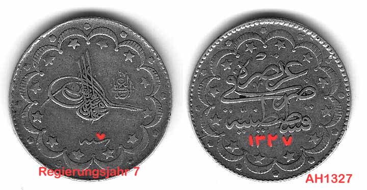 AH 1327 (AD 1909) als Regierungsantritt und das 7. Regierungsjahr = AD 1915 (vor Verschiebungen durch das christliche Sonnejahr und das muslimische Mondjahr sei gewarnt).