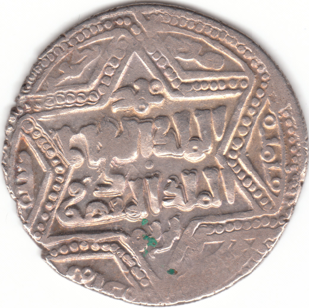 Es handelt sich um eine Silbermünze, 2,9 g, 22 mm. Das Design ist auf beiden Seiten von einem die ganze Münze ausfüllenden sechseckigem Stern geprägt, der von zwei durchgezogenen Linien begrenzt ist, in der Mitte verläuft eine weitere Linie aus Punkten. Die Schrift scheint mir arabisch zu sein, wenngleich nicht vom heute üblichen Typ. Ich bin mir eigentlich sicher, ähnliche Stücke hier schon gesehen zu haben. Meine Literatur gibt auf den ersten Blick (KM, Yeoman, Craig) nichts her, also wird das Stück wohl etwas älter sein.