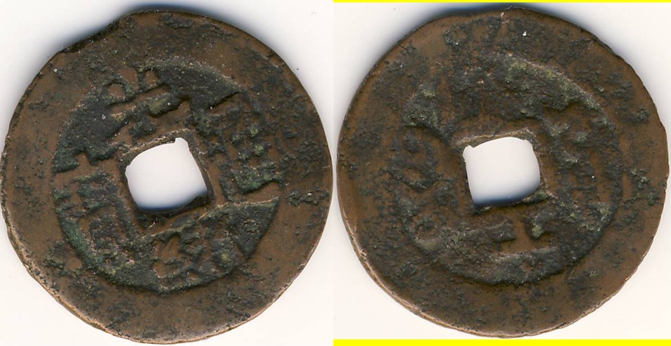 Mal wieder ein 10er aus Sinkiang. Im Gegensatz zum sonst eher geordneten Münzwesen Chinas herrschte hier immer eine gewisse "Anarchie". Das beginnt schon beim Material, was bei Sinkiang-Cash immer Kupfer statt Messing ist, geht über die Vielzahl von Münzstätten bis zum Vorkommen arabischer Schrift, wie bei den beiden oben gezeigten. Hier der 10er aus der Kuche Mint (KM # 7.1):