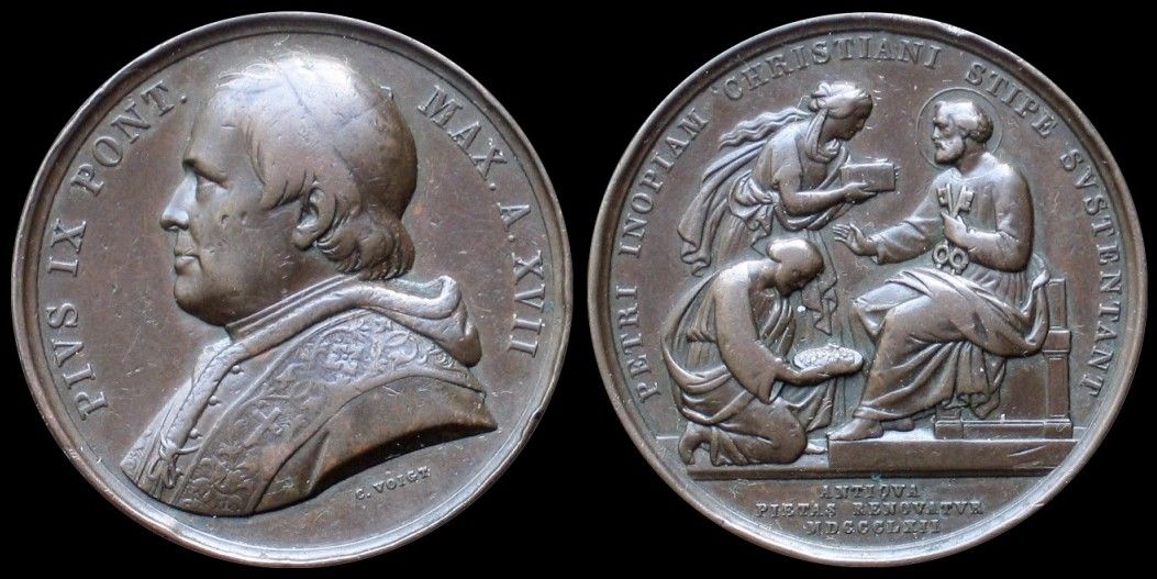 Medaille AN XVII = 1862 (v. C. Voigt) auf die Revitalisierung des „Peterspfennigs“ 1862. Brb. in Mozetta mit Stola und Calotta n.l. / PETRI INOPIAM CHRISTIANI STIPE SVSTENANT - ANTIQUA PIETAS RENOVATVR MDCCCLXII Nimb. Petrus thront n.l. und empfängt zwei Katholikinnen, die ihm Kassette und Geldteller bringen. Br-43 mm, Spink 2292 (?), Bart. 862 (?). Bart (Pio) XVII,1 (?).