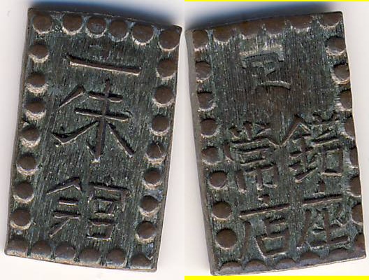 Links im Bild 1 Shu (Rückseite) der Ära Kaei (1853-1865); links 1 Shu der Ära Meiji (1868-1869 herausgegeben).