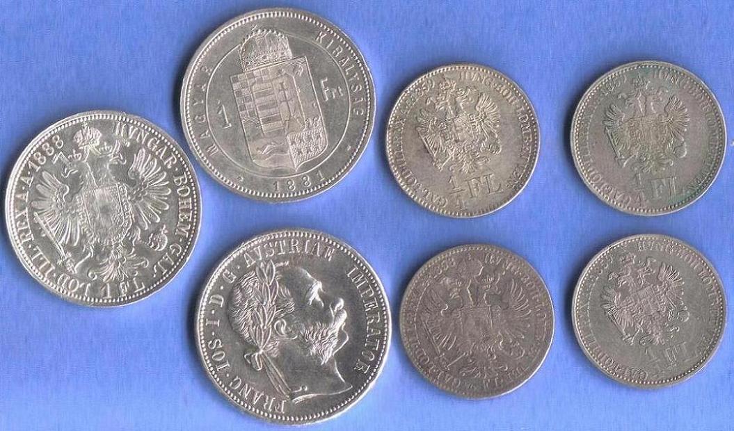 Der Gulden (Florin) war zwischen 1857 und 1892 in Österreich die Silberwährung (1 Gulden = 100 Kreuzer). Es gab von 1870 bis 1892 8- und 4-Gulden Stücke als Goldmünzen, 2- (ab 1859), 1- (ab 1857 bzw. schon früher) und 1/4-Gulden-Stücke als Silbermünzen. Ab 1857 wurden im Unterschied zu den anderen deutschen Staaten aus 500g Silber 45 Gulden geprägt (45-Gulden-Fuß). Am Rändel der Münzen steht übrigens der Wahlspruch des Kaisers: VIRIBVS VNITIS - "mit vereinten Kräften".