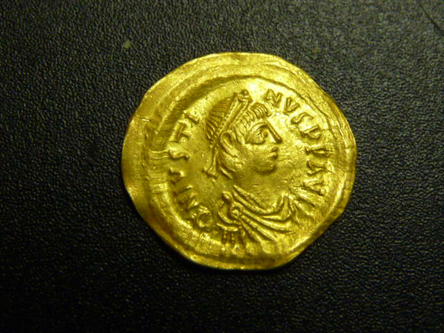 es handelt sich nicht um einen Tremissis von Justinus II., sondern von Justinus I. (518-527), Sear 58, MIBE 5. Die Typen unterscheiden sich nicht durch eine allenfalls abweichende Legende (ist bei beiden gleich - Schluss-C mehr oder weniger klar), sondern durch den Stil. Justinus I. ist viel "naturalistischer". Vgl. auch die Abbildung unter http://www.wildwinds.com/coins/sb/sb0058.html.