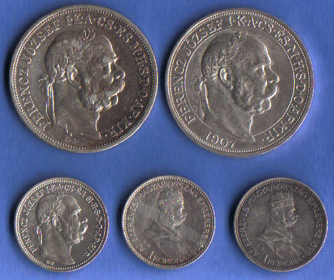 Im Jahr 1892 wurde im Kaiserreich die Kronenwährung eingeführt (1 Krone = 100 Heller). Die 1 Kronen Münzen wurden aus 836er Silber (5 Gramm, Ø 23mm) ab 1892, die 2 Kronen Münze ab 1912 ebenfalls aus 836er Silber (10g., Ø 27mm) und ab 1900 die 5 Kronen Münze aus 900er Silber (24g., Ø 36mm) in beiden Reichshälften geprägt.