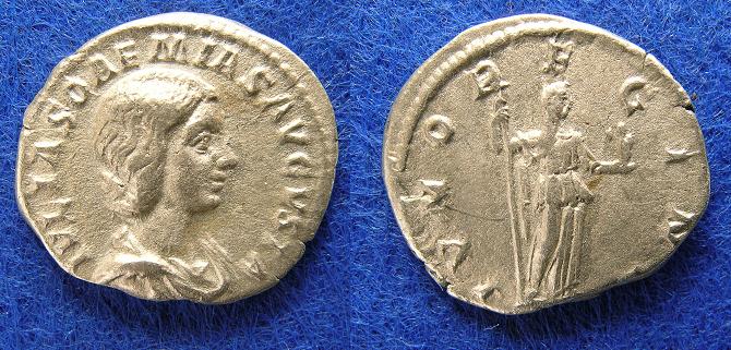 Von ihr dominiert ein einziger Rückseitentyp die gesamte Münzprägung, nämlich Venus Caelestis sitzend oder stehend. Dieser Typ macht 98% (geschätzt) ihrer Münzprägung aus. Dann gibt es noch die Antrittsausgabe, die ich hier vorstellen möchte. Alle anderen Typen sind Hybridprägungen oder antike Fälschungen (oder natürlich moderne...).