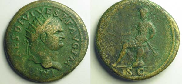 Das Stück ist mit unedierter, verkürzter Avers-Legende, die im RIC bekannte Avers-Legende beginnt genauso wie auf diesem Stück, IMP T CAES DIVI VESP F AVG P M, aber mit der Fortsetzung TR P P P COS VIII, die auf meiner Münze fehlt. Ebenso fehlt am Revers die Legende ROMA, nur das SC im Abschnitt stimmt mit der bekannten Prägung überein. Das bekannte Stück mit langer Legende ist RPC 507, BMC 314, RIC 183 Münzstätte Thrakien; die Gruppenzugehörigkeit ist sicher, die Lokalization der Münzstätte bleibt aber nur eine Vermutung, neben Thrakien ist auch Bithynien möglich.