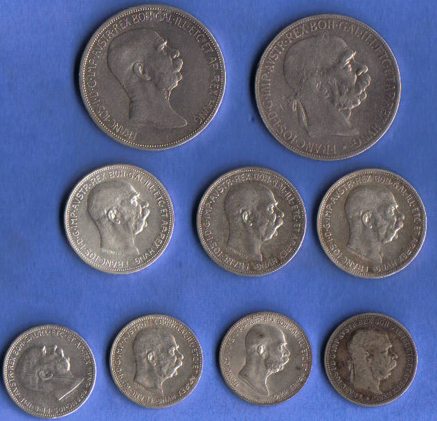 Im Jahr 1892 wurde im Kaiserreich die Kronenwährung eingeführt (1 Krone = 100 Heller). Die 1 Kronen Münzen wurden aus 836er Silber (5 Gramm, Ø 23mm) ab 1892, die 2 Kronen Münze ab 1912 ebenfalls aus 836er Silber (10g., Ø 27mm) und ab 1900 die 5 Kronen Münze aus 900er Silber (24g., Ø 36mm) in beiden Reichshälften geprägt.