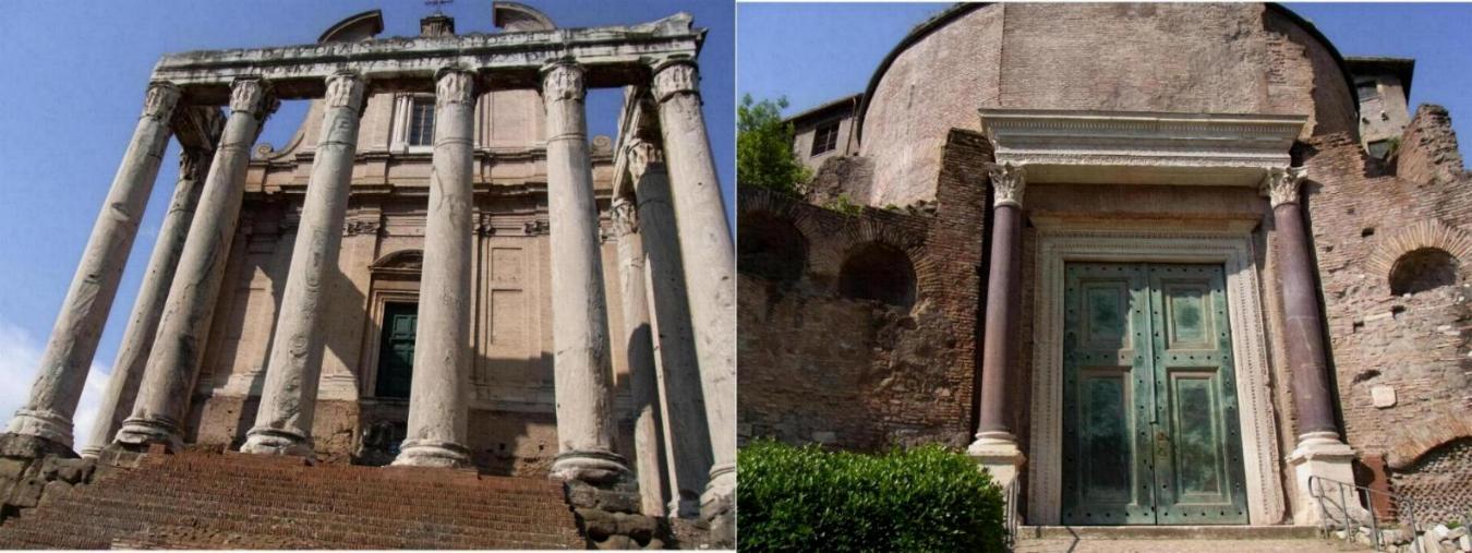 Der Tempel des Romulus (rechts) und der Tempel des Antoninus Pius und Faustina Mater (links):