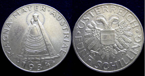 Das Motiv zeigt die "Magna Mater" von Maria Zell (Wallfahrtsort in de Steiermark) und wurde in Silber von 1934 - 1936 geprägt, es gibt dieses Motiv auch auf den Goldmünzen zu 100 Schilling (100 Schilling 1935 - 1938).