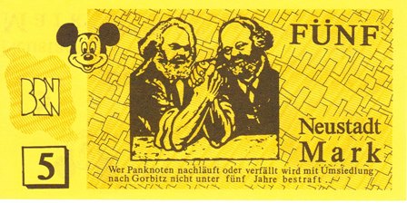 Hallo, die Diskussion über die Regionalwährung hat mich daran erinnert, daß es auch privates Geld für öffenliche Feste gibt. In Dresden gibt es jährlich mehrere Stadtteilfeste, die alle nach der friedlichen Revolution entstanden sind. Das älteste und angesagteste ist die "Bunte Republik Neustadt" (gemeint ist die Neustädter Seite von Dresden). In den ersten beiden Jahren,1990 und 1991, hatte man sogar Geld gedruckt welches in den drei Tagen Fest zum Einsatz kam. Es gab Scheine in den Stückelungen 1,3,5,10 und 20 Mark. Hier mal zwei Beispiele von 1991. (zur Erklärung:Gorbitz ist ein Plattenbaustadtteil von Dresden und damit genau das Gegenteil von Neustadt) Gruß ischbierra
