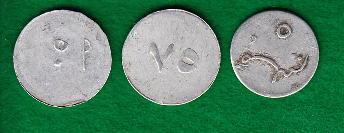 Die beiden anderen fallen stilistisch heraus. Die Schrift wirkt eher pseudoarabisch. Beim 50er müssen beide Bilder 90° gegen den Uhrzeigersinn gedreht werden; der 75er steht richtig.