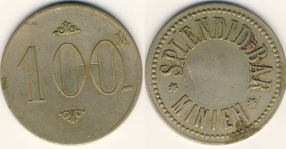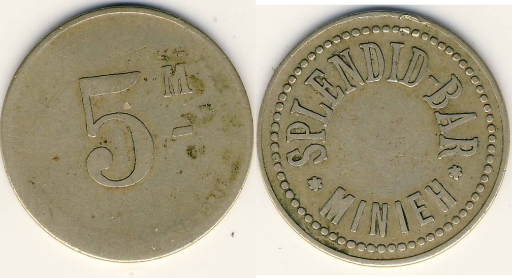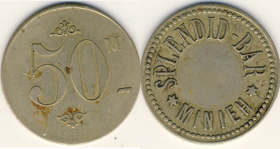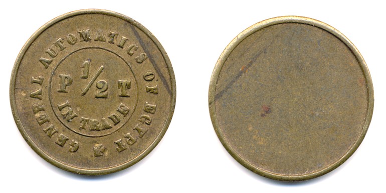 Von diesem Unternehmen gab es zumindest noch einen weiteren Token. Den habe ich leider nicht, kann ihn also hier nicht im Bild vorstellen. Die Umschrift lautet hier etwas anders: "The Old Egyptian Automatic Mashine Comp.". Im Kreis steht kein Nominal, sondern das Wort "Consumption". Vermutich Token, die man in Automaten einwerfen konnte, die überall an der Straße standen und Blumen, Schokolade, Getränke oder was auch immer dafür ausspuckten. Sie stammen schätzungsweise aus den 1930er/40er Jahren.