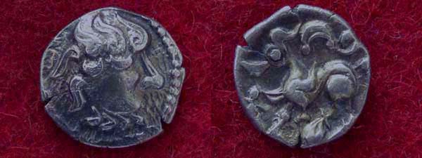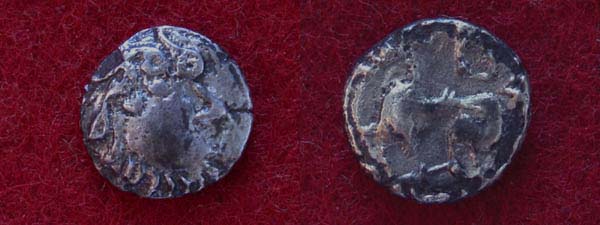 Von der Münzbörse in Hannover habe ich mir heut eine keltische Münze mitgebracht, die mich zwischen lauter artfremden Metallscheiben in einer Kiste anlächelte und "Kauf mich!" flüsterte. Ich habe sie soeben zu bestimmen versucht. Meine laienhafte Meinung ist: