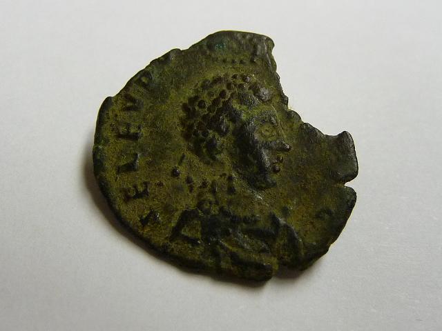 Ich lese AEL EVDO und ALVS REI. Man erkennt noch den Kranz über ihrem Kopf, der von einer nur noch zu erahnenden Hand gehalten wird. Victoria schreibt das Christogramm auf einen Schild.