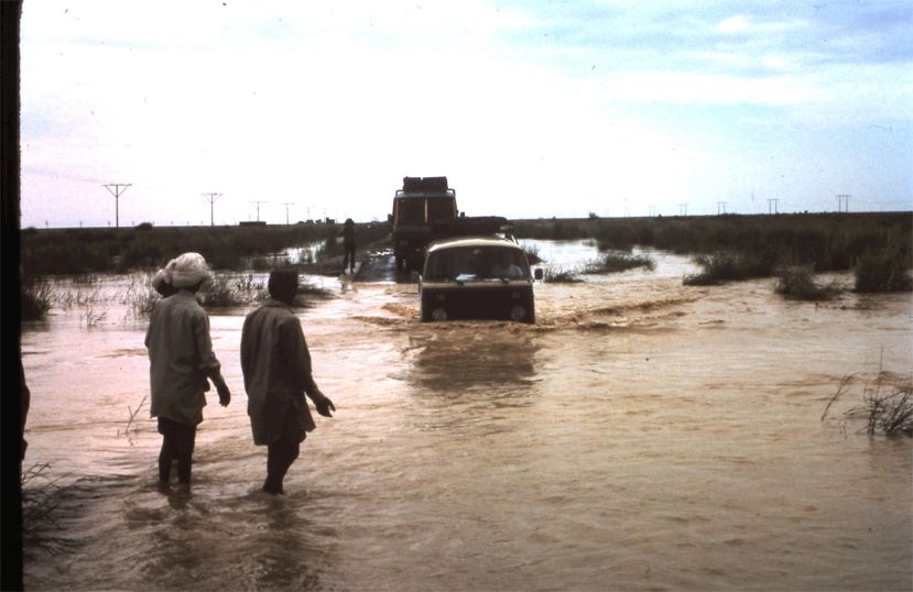 Es kam uns ein anderer VW-Bus Fahrer entgegen. Er sagte, andere liegen fest, Motor ist voll Wasser gelaufen. Er hatte es nur geschafft, weil er mit Vollgas, schwimmend, an einem LKW gebunden, die Wasserflächen überwinden konnte.