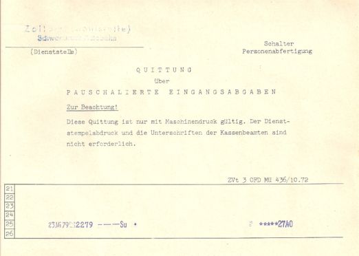 Die Zöllner schätzten den kleinen Teppich meines Freundes auf 100 DM, Zoll 10 DM; Schnaps aus Österreichl; Tee aus Nepal, weil wir den nicht angegeben hatten, also doppelter Zoll. :headbang:
