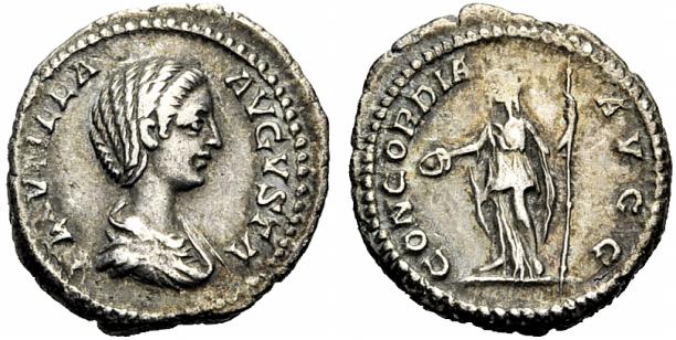 Denar (3,24g), Roma 202-205 n.Chr. Av.: PLAVTILLA - AVGVSTA, Büste mit Drapierung n.r. Rv.: CONCORDIA - AVGG, Concordia mit Patera und Szepter v.v., Kopf n.l. RIC 363a, RSC 1.