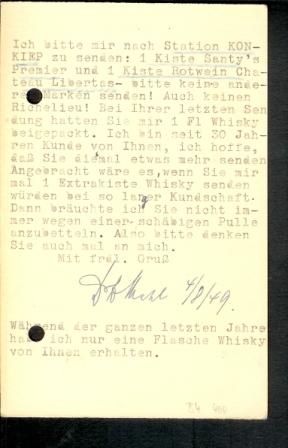 Ich bitte mir nach Station KONKIEP zu senden: 1 Kiste Santy's Premier und 1 Kiste Rotwein Chateau Libertas- bitte keine anderen Marken senden! Auch keinen Richelieu! Bei Ihrer letzten Sendung hatten Sie mir 1 Fl Whisky beigepackt. Ich bin seit 30 Jahren Kunde von Ihnen, ich hoffe, daß Sie diesmal etwas mehr senden. Angebracht wäre es, wenn Sie mir mal 1 Extrakiste Whisky senden würden bei so langer Kundschaft. Dann bräuchte ich Sie nicht immer wegen einer schäbigen Pulle anzubetteln. Also bitte denken Sie auch mal an mich.