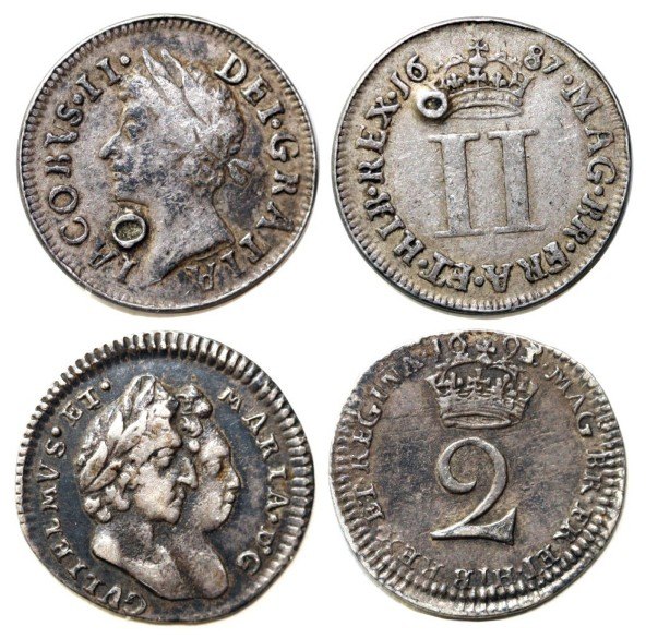 Diese zweite Medaille führt nach Irland und erinnert an die Schlacht am Boyne am 1. Juli 1690. Hier standen sich Schwiegervater und Schwiegersohn als Kontrahenten gegenüber - zur Illustration der beiden zeige ich zwei kleine Nominale aus dem Zahlungsverkehr.