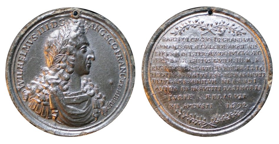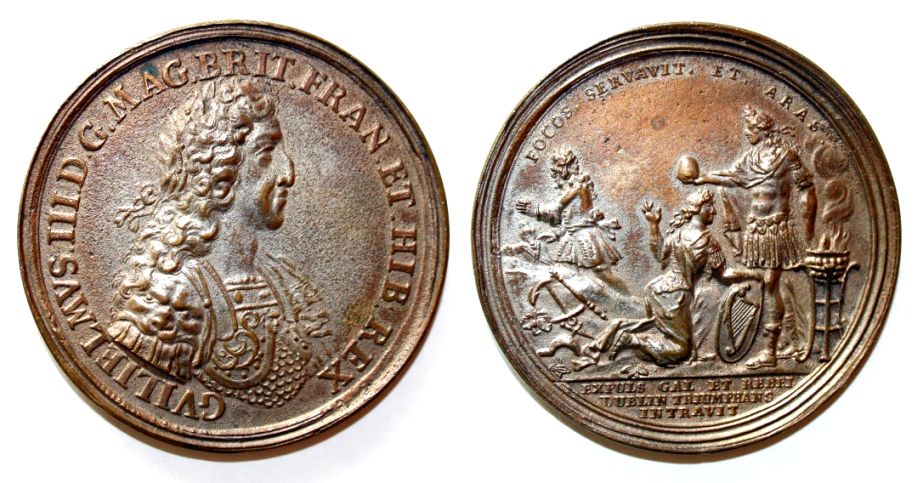 Am Fluß Boyne wurde James II. Stuart von französischen und irischen Einheiten unterstützt, auf Seiten Williams III. kämpften - zahlenmäßig weit überlegen - neben holländischen Garden französische Hugenotten und Söldner aus den verschiedensten europäischen Ländern. Die Schlacht endete mit dem Sieg Williams und dem folgenden Einzug in Dublin. Die Medaille, die an dieses Ereignis erinnert, könnte ein