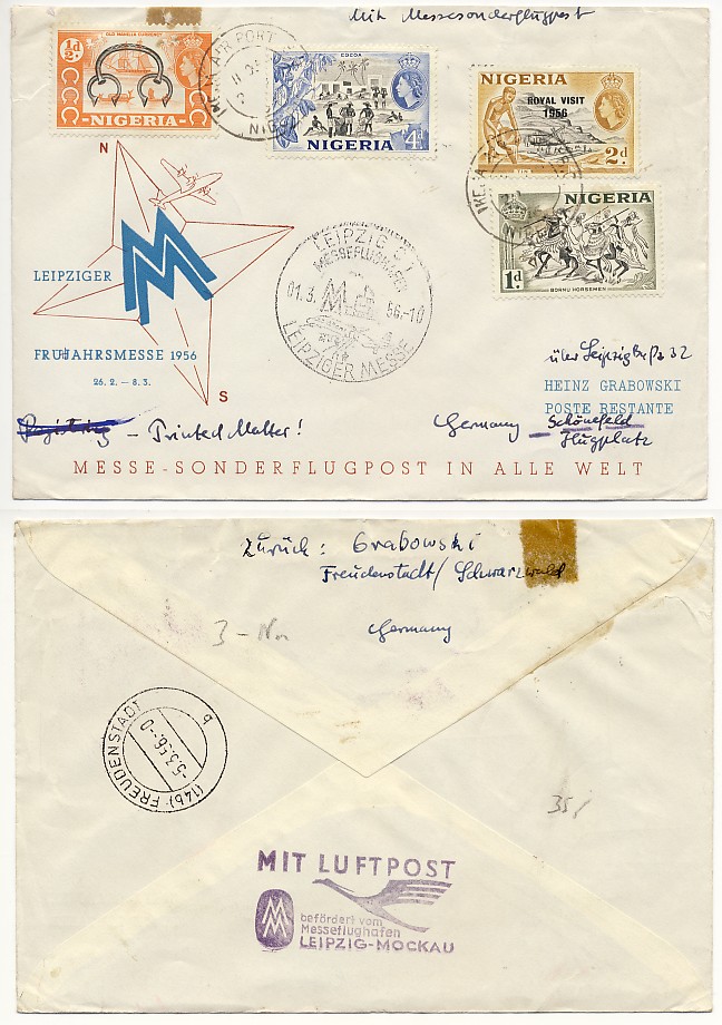 Ach ja, beinahe hätte ich nochwas vergessen. Im oben angegebenen Wiki-Link seht Ihr eine langweilig ungestempelte Briefmarke aus Nigeria mit einer Manilla-Abbildung auf der die Bemerkung “Old Manilla Currency“ zu lesen ist. Wenn meine Manilla wegen Schiffbruchs schon nicht den Weg nach Afrika gefunden hat, möchte ich bei dieser Gelegenheit doch wenigstens einen Briefumschlag vorstellen, der diese bei Wiki vorgestellte Briefmarke zeigt und der einen wirklich interessanten, durch Stempel bezeugten Weg hinter sich gebracht hat. Leider ist das Kuvert durch amateurhafte Krakeleien etwas verunstaltet, aber trotzdem interessant. Der Stempel aus Nigeria ist vom Datum her für mich nicht zu identifizieren. Jedenfalls wurde der Brief am Ikeja-Airport in Lagos auf die Reise geschickt und erreichte den Messeflughafen in Leipzig am 1. März 1956. Auf der Rückseite des Umschlages erfährt man, daß das Teil am 5. März 1956 in Freudenstadt im Schwarzwald angekommen ist. Nette Tour!